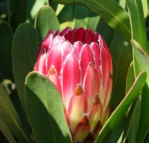 The Protea has many different types, as indicated by the origin of the name ‘Protea’ – it comes from the mythical Greek God Proteus, who could change his form at will. Some of the more common varieties of Protea that are produced en masse for florists include the King Protea, Queen Protea, Honey Protea, Pink Ice and Pink Mink. Proteas are large flowers, and King Proteas can open up to 20 centimetres across. They grow on woody stems and have sturdy long leaves, which brown or spot easily. The Protea flower itself is formed by many bracts that curve up and slowly open outwards, revealing a fluffy flower centre. The bracts and flower may be orange, cream, brown, pale pink, red or a combination of these.